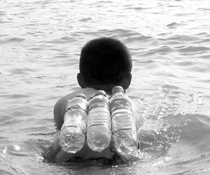 本报综合消息 6月20日下午,记者在南昌大桥一带的赣江水域看到,许多孩童模仿一些水性好的游泳者,把矿泉水瓶用绳子绑在背部当“救生衣”,然后朝赣江深水处游去。
