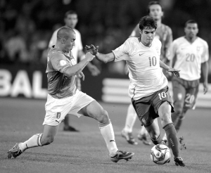 巴西队球员卡卡(前右)突破意大利队球员卡纳瓦罗的防守