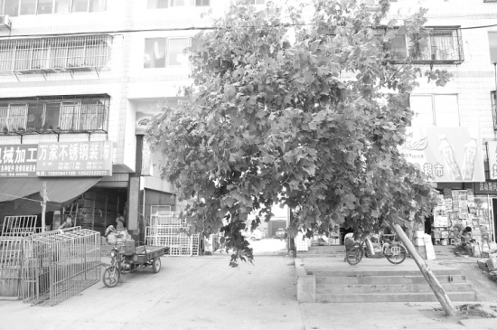 周口市区中州北路北方汽车修理厂门前一棵树在6月14日的强对流天气中被风刮歪,树的根部露了出来,因树枝遮挡,门前道路十分狭窄,车辆行人进出很不方便,市民盼望有关部门将其扶正。 实习生 李鑫 摄
