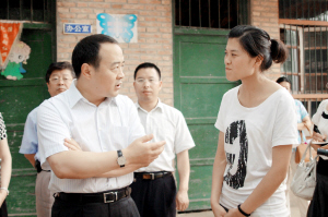 另据了解,6月22日,周口市妇女联合会授予李灵“周口市三八红旗手”荣誉称号。(左图为毛超峰向李灵询问学校情况)(相关报道详见04版)
