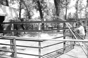 不远处,大象“避暑”还有专人伺候。饲养员拿来水管,把水喷洒在大象身上。感到清凉的大象高兴地“手舞足蹈”,一边抖动身体一边用鼻子玩水。市动物园一位负责人介绍,这么热的天,他们为给大象消暑使出浑身解数,每天不仅要为它冲澡十几次,还要喂上黄瓜、西红柿等蔬菜水果50多公斤,必要时还要盖上遮阳棚。