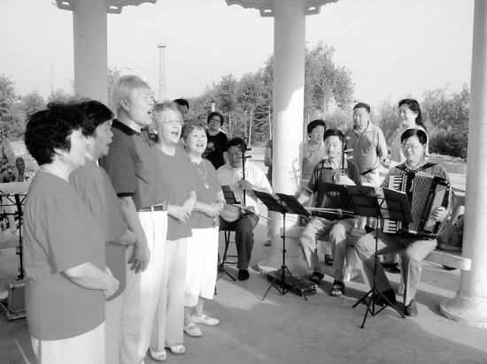 “北风那个吹,雪花那个飘……”近日,在市区滨河路民族广场活跃着一支老年业余合唱团,他们大部分是由市中心医院的退休人员组成。据合唱团负责人介绍,在建国60周年来临之际,合唱团以演唱革命歌曲的方式,来表达他们对祖国的热爱之情。 通讯员 王羡荣摄