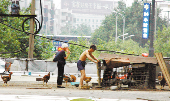 川汇区中州路周口人民商场北侧,有位住户在自家楼顶平台养了一群鸡,还搭建了鸡棚,楼顶平台变成“乡村农舍”。昨天有市民来电反映,称此处地处繁华地段,周围都是高楼,人们从高处往下望,感觉很是不雅。 晚报记者 朱海龙 摄