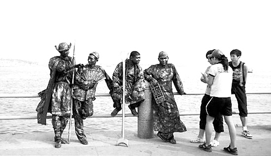 近日,山东青岛市五四广场上的“真人雕塑”吸引游客“眼球”。这些古铜色的“真人雕塑”有的打扮现代、有的古朴,倚靠在广场的栏杆上,不断变换着姿势与表情。由于他们从头到脚被喷上了古铜色油彩,其肤色独特,打扮各异,吸引了大批游客的目光。中新 摄