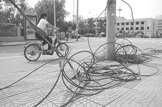 昨天,市民刘先生致电本报,称周口市区七一路与文明路交叉口人行道上,一根线杆上的电缆断落散了一地,除存在安全隐患外,还不太雅观,行人一不小心就会被这些电缆“缠”住。他希望有关部门能尽快固定好这些电缆。晚报记者 朱海龙 摄