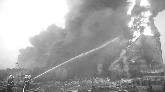 河南洛阳一化工厂爆炸 7月15日晨,消防人员在发生爆炸事故的河南洛染公司厂区灭火。当日凌晨2时许,位于河南洛阳偃师市顾县镇的河南洛染股份有限公司发生爆炸事故,爆炸引燃大火,刺鼻气体弥漫。当地消防、环保等部门迅速抢险救援,阻断洛染公司出水口,疏散群众。7时40分许,大火被扑灭。爆炸发生时,这家企业在岗及值班人员共有17名,其中7人死亡,9