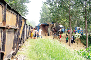当日9时许,记者接到线索立即驱车赶到现场。在淮阳县安岭镇火车站南约200米安岭至临蔡镇公路与一铁路道口交汇处,一辆货车侧翻在地,附近铁轨和路沟内撒满了麦子,车主正组织人员收拾散落的麦子。不远处,一列运煤小火车停在铁轨上。