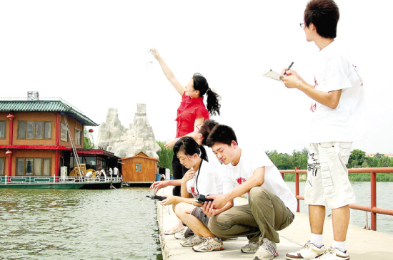 河南农业大学林学院的几名大学生在淮阳龙湖岸边取样,对龙湖水质进行现场监测。据了解,他们利用暑假,在专业教授带领下开展社会实践活动,通过现场操作,加深对所学专业知识的理解。 晚报记者 杜欣 摄