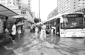 7月30日,上海市斜土路靠近小木桥路一公交站点,齐膝的积水给路人带来诸多不便。当日,受较强的降水云团影响,上海出现短时强降水天气。上海中心气象台发布暴雨红色预警信号。新华社发