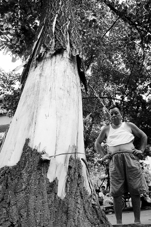 看门的祝师傅告诉记者,该院紧临马路,每天早上都有商贩在此摆摊卖早点。7月31日凌晨4时左右,他隐约听到外面有类似劈柴的声响,以为是卖早点的摊贩生火做饭,便没起来看,早晨起床后才发现门口的树被人剥了皮。