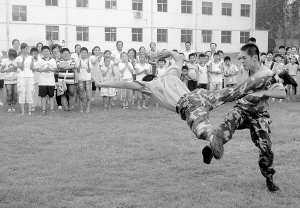 随后,小记者们又参观了荣誉室和图书室。9时30分许,小记者们来到训练场,观看战士的擒敌拳和散打格斗表演。武警战士身手矫健,动作整齐划一,一招一势有章有法。小记者们看得十分过瘾,掌声一浪高过一浪。表演结束后,小记者们纷纷跑到战士跟前要“拜师学艺”。