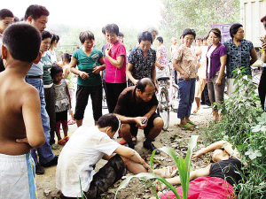 8月4日15时许,商水县备战路和老城路交叉口,两名骑摩托车的年轻人被一辆红色昌河车撞倒,一名年轻人当场昏倒,另一人头部血流不止(如图)。见此,有市民急忙拨打120,但昌河车司机却慌忙逃逸,围观群众纷纷谴责昌河车司机不道德。晚报记者 马治卫 摄