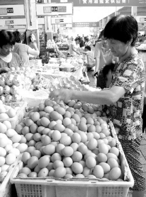 “大前天买的一斤才3.3元,怎么今天就涨到3.5元了?”在七一路一菜市场购买鸡蛋的市民刘女士说。“之前,鸡蛋价格一直稳定在3.1元一斤左右,但最近一周鸡蛋价格一天一个样,今天已经调整到3.5元一斤了,估计明天我这儿要卖到3.6元了。”正在给刘女士称鸡蛋的摊贩说。