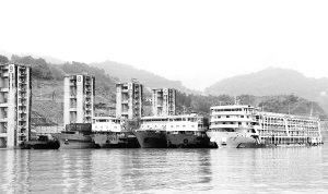 8月4日上午,货轮停靠在三峡坝区上游兰陵溪锚地,等待三峡船闸恢复通航。受长江上游持续暴雨天气影响,三峡入库流量猛增。截至8月4日14时,入库流量已达每秒45000立方米,三峡船闸停止通航。面对入汛以来长江最大流量洪水,中国三峡总公司已做好相应准备,目前已开启多个泄洪孔泄洪。新华社发