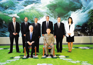 这张朝中社昨天提供的照片显示的是朝鲜最高领导人金正日(前右)和美国前总统克林顿(前左)在平壤合影。据新华社报道,此前被朝方判刑的两名美国女记者已于昨天上午与克林顿同机回国。新华社/朝中社