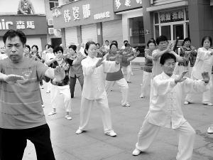 为迎接8月8日我国首个“全民健身日”,昨天上午,40多位市民在扶沟万商广场表演太极拳。晚报记者 金月全 摄