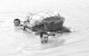 霞浦县牙城镇村民在水中抢运抢收海鱼。新华社发