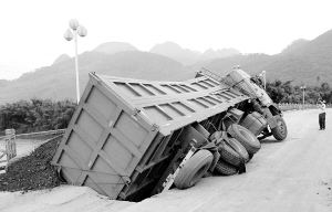 超载运煤车压塌公路桥路面