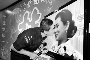 8月8日,新郎王学峰通过电视电话会议系统与电视屏幕中的新娘李丽华“亲吻”。这是一场爱人“缺席”的婚礼,也是一场完整的婚礼,新郎、新娘相隔万水千山,却在同一时刻“牵手”走入婚姻殿堂。8月8日晚8时8分,由于特殊原因,坚守在乌鲁木齐“维稳”第一线的特警王学峰与远在辽宁鞍山的新娘李丽华举行了一场特殊的婚礼,让两地的亲属和战友共同见证了他们的“爱情宣言”。