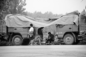 昨天,在周口市区七一东路旁,两辆汽车的车头间,两名男子“楚河汉界”“杀”得正欢。阿龙 摄
