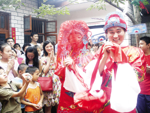 本报讯 大红的花轿、悠扬的唢呐,新郎头戴状元帽、身着龙凤大红袍。迎亲队伍所到之处,沿途市民纷纷驻足观看,不少人还掏出手机、相机拍照。这是昨天上午淮阳一对新人举行的一场古装婚礼。