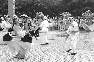 项城市委、市人民政府高度重视全民健身活动,在市中心广场经常开展不同形式的娱乐休闲和体育活动,受到了广大市民的普遍欢迎。图为8月8日,该市老干部(职工)文体队,在该市中心广场表演“拉犟驴”。牛立坡 摄