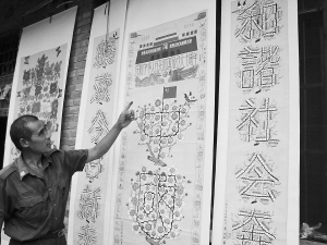 刘连记告诉记者,如今国家惠农政策好了,群众生活富裕了,老百姓的心宽气顺了,希望通过书画展来表达对祖国60岁生日的庆祝。