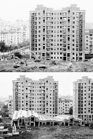 这幅拼版图片的上图为:8月13日,上海市闵行区“莲花河畔景苑”倒覆楼房全部拆除完毕;下图为6月29日拍摄的倒覆楼房。新华社发
