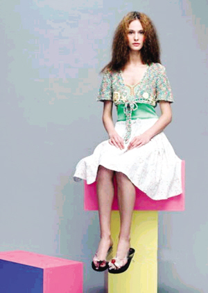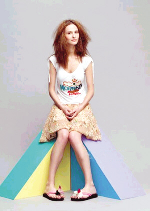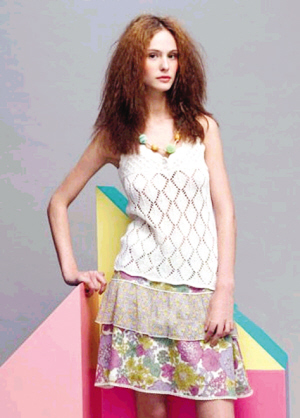 艳丽的针织贝壳衫带出几分顽皮气息,白色印花裙流露邻家女孩般的甜美气质。