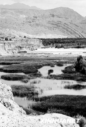 黄河上游湿地与周围丹霞地貌相映成画(8月13日摄)。 新华社发