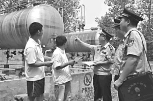 8月15日上午民警冒着酷暑在市经济技术开发区液化气站检查罐体降温情况。为确保消除国庆消防安全隐患,市公安局沙北分局金海路派出所民警利用周末休息时间,对辖区内的7处易燃易爆场所进行了再次检查。郁发顺 王向东 摄