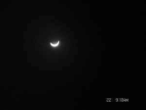 时间在一秒秒地流失,太阳初亏了。但它仍羞答答,在云中和人们玩起了捉迷藏。人们也只能透过云缝才能察觉到这位“焦点人物”的存在。但是,随着太阳地平高度的升高,乌云好像已经开始退缩,被“吞”了三分之一的太阳终于又露出了脸。愈聚愈多的人群中随之爆发出一阵兴奋的喊叫声和相机的咔嚓声——大家都想抓住这个机会,生怕它一会儿又要失踪!确实,太阳太喜欢捉迷藏了,不一会儿就又被云给挡住了,不过从云块的大小来看,用不多久就会再出来的。果然,几分钟后太阳又出来了。或许是玩累了,也可能是被人们的热情感动了,这次太阳是大大方方地呈现在了人们的面前,周围已经没有什么东西能遮住它了。只是此时太阳已经只剩三分之一了。