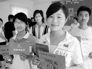 农民工子女、准大学生胡文杰(右一)手拿大学录取通知书和刚刚领到的助学金喜形于色。8月20日上午,同胡文杰一样,在商水县举行的“金秋爱心助学款”发放仪式上,该县54名家庭贫困的农民工子女,凭大学录取通知书领到了助学款。