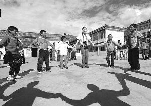 8月23日,中华慈善总会IDO儿童基金会的志愿者与拉萨儿童福利院的孩子们在做游戏。
