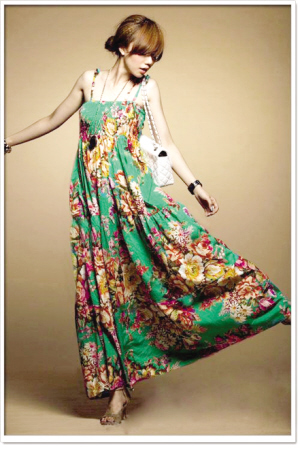▲相比起红色长裙的大气,绿色的版本则更显青春活力,清新的花柄图案很有感染力,充满华贵感的花朵热烈地绽放,把夏天的活力尽情释放。