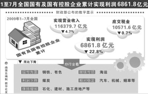 统计显示,1至7月全国国有企业累计实现利润6861.8亿元,同比下降22.8%,降幅比1至6月减小4.2个百分点,7月比6月环比下降2%。