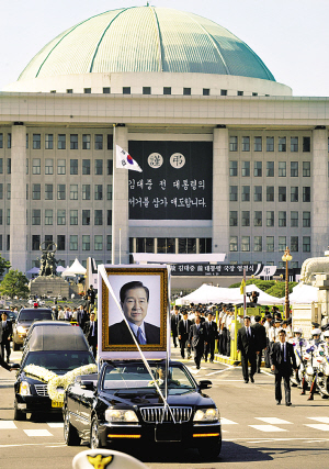 遗体告别仪式结束后,金大中棺椁在大约30辆警用摩托车护卫下,运往安葬地点国立显忠院。
