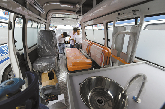 8月25日,几名乡镇卫生院的工作人员在河南人民会堂广场查看新装备的救护车。 当日,河南省600所中心乡镇卫生院第二批救护车装备项目发车仪式在郑州举行,这次共为河南农村中心乡镇卫生院装备了117辆救护车。河南省将用3年的时间集中财力建设和装备600余所中心乡镇卫生院,切实改变农村医疗落后的局面,缓解河南农村看病难、看病贵的问题。新华社