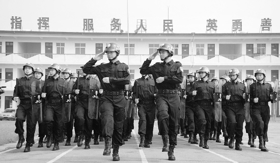 昨日,在武警周口支队某训练基地,来自周口中院的司法警察正刻苦训练。据了解,这些司法警察已经在这里进行了一个月的封闭训练,主要训练的有阅兵式、分列式、警棍盾牌操等,他们准备以一流的训练成果向建国六十周年献礼。 晚报记者 朱海龙 摄