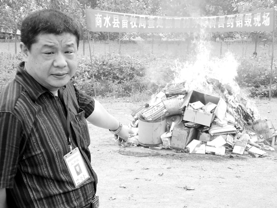 一批假冒伪劣兽药被集中销毁。为确保畜产品质量安全,震慑制售假冒伪劣兽药坑农害农行为,8月26日上午,商水县畜牧局在该县县城西郊公开销毁了近期打假中没收的假冒伪劣兽药。据了解,这次集中销毁的假冒伪劣兽药有1万多支,价值4.7万元。 晚报记者 马治卫 摄 线索提供 杜强