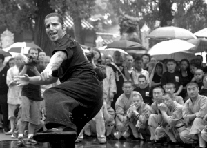 河南省登封市是全国著名的“武术之乡”,少林武术的发源地。近年来,登封市以少林功夫为突破口,用国际化理念开发独具特色的功夫文化,计划到2020年把登封建成为现代化国际文化旅游目的地城市,成为名副其实的“世界功夫之都”。图为一名“洋弟子”在少林寺山门前表演少林拳法。新华社记者 王颂 摄