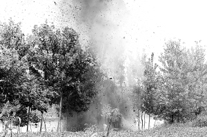 按照国家相关规定,警方决定就近销毁这91枚炮弹。8月29日10时至13时,经过认真选址、挖坑、安放,91枚炮弹被集中销毁。记者在销毁现场看到,炮弹爆破瞬间,泥土四处飞溅(如图2),炸出的弹坑直径足有两米多。线索提供 朱金光 刘兴刚
