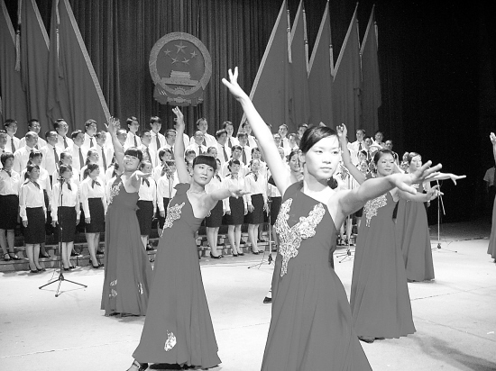 9月3日上午,郸城县红歌大赛在县人民会堂举行。铿锵的军乐、嘹亮的红歌、优美的舞蹈,把人们淹没在庆祝祖国60周年华诞的喜庆气氛之中。比赛中,舞蹈被巧妙地融入进来,使呆板的站立式合唱变成边唱边舞,市民看得如痴如醉。 晚报记者 徐松 摄