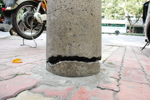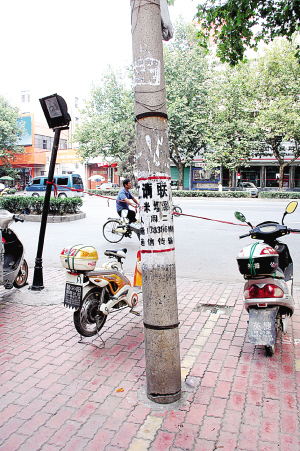 周口市区中州路一家电器店门前,一根电线杆根部破裂,像张了个大嘴,很是危险。晚报记者 朱海龙 摄
