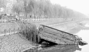 昨日上午,一辆货车行至鹿邑太清宫镇境内时,因司机疲劳驾驶冲入路边河内。所幸未造成人员伤亡。晚报记者 侯国防 摄