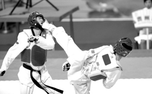 本报综合消息 9月9日晚,在山东滕州举行的第十一届全国运动会跆拳道男子58公斤级决赛中,河南选手左毅以5比3战胜贵州选手裴广奇,夺得金牌。(范长国)