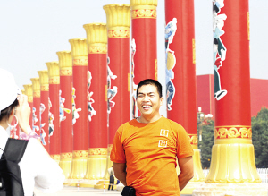 9月14日,一名游人在北京天安门广场东侧的“民族团结柱”前拍照留念。