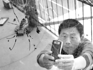 9月23日,在商水县胡集镇蒋桥村一农家院内,记者发现有一只大蜘蛛在铁栏间织网安了家。因其个头比一元硬币还要大,活似一只小雏蟹,引得一位青年拿出手机拍照。