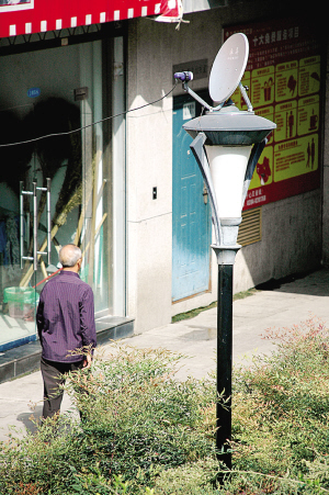 周口市区五一广场,一根路灯头上顶着一个卫星电视锅子,不仔细看还以为是高科技“卫星”路灯。这位安装卫星电视锅子的主人真会“动脑筋”。 晚报记者 朱海龙 摄