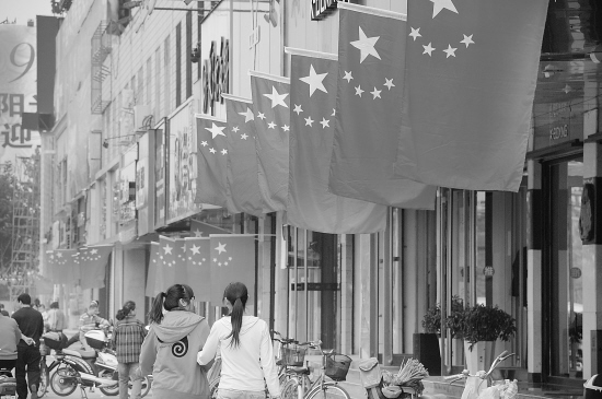 昨日,在市区七一中路商家门口飘扬着国旗。随着国庆节的临近,商家和市民或用鲜花摆出各种和国庆有关的图案,或悬挂国旗表达拳拳爱国之心,成为周口街头一道亮丽的风景线。 晚报记者 朱海龙 摄